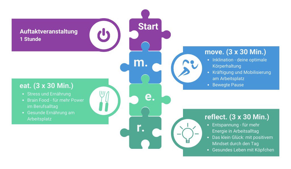 Das hier beispielhaft dargestellte Programm findet online und dennoch persönlich statt. Es ist auf 11 Wochen angelegt. Nach einer einstündigen Auftaktveranstaltung in Woche 1 folgt wöchentlich eine Einheit aus den drei Bereichen von move.eat.reflect. In Woche 2 würden wir mit einer Bewegungseinheit (move.) starten, in Woche 3 folgt eine Einheit zum Thema Ernährung (eat.) und in Woche 4 gibt es eine Einheit zum Thema Entspannung und mentale Gesundheit (reflect.). Danach beginnt unser "Gesundheitszyklus" von vorn.